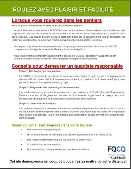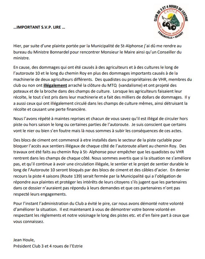 16 novembre 2020 Pour ceux qui sont intéressé a suivre le cours de conduite, vous pouvez contacter Alain Pelletier au numéros suivant: 450 777 1488 Questions/Réponse sur l’achat du droit d’accès en ligne. Toute l’information pour les quadistes sera en ligne dès aujourd’hui sur notre site internet et notre page Facebook: VOICI HYPERLIEN POUR L’ACHAT DE DROIT D’ACCÈS EN LIGNE DIRECTEMENT POUR LE CLUB MERCI DE VOTRE ENCOURAGEMENT  Vidéo A venir Important : Il est nécessaire d’avoir une adresse de courriel distincte pour chaque propriétaire de véhicule. (Sans quoi les véhicules seront tous au même nom.)  ———————————————————————————————- 28 août 2020  Assemblée générale des membres du Club 3 et 4roues de l’Estrie le jeudi 3 septembre 2020 à 19 heures. À cause du Covid nous ferons la réunion par vidéo conférence. Des instructions suivront dans les prochains jours. —————————————————————————————— 12 août 2020 Important message reçu de la FQCQ. Vous trouverez en pièce jointe un communiqué qui a été émis par le Ministère des Forêts, de la Faune et des Parcs en date d’hier. Ci-dessous le lien afin d’accéder directement au site officiel du MFFP : Travaux en cours dans le secteur de la route 139 et boulevard industrielle (Granby). Soyez prudent, présence de machineries en sentier et il se peut que le sentier soit dévié selon les besoins du MTQ. 25 mai 2020 Le sentier Cowansville à Granby est ouvert. N’oubliez pas, ouvert jusqu’à la 112 (Principale) à Granby. donc le sentier au nord de la 112 reste fermé.  ———————————————————————————-  24 mai 2020 Vu que nous avons l’autorisation, demain le club va faire l’inspection du sentier et la mise à niveau de la signalisation du sentier 4 saisons. Prenez note, les sentiers le long de l’autoroute 10 sont des sentiers d’hiver seulement. Merci de votre patience. ——————————————————————————————————————————————–  VOICI HYPERLIEN POUR L’ACHAT DE DROIT D’ACCÈS EN LIGNE DIRECTEMENT POUR LE CLUB MERCI DE VOTRE ENCOURAGEMENT ———————————————————— Message important à tous les membres du Club 3 et 4 roues de l’Estrie Veuillez prendre note que Monsieur Bruce Ditcham n’a pas fait renouveler son mandat de président de notre club. Bruce fait partie du club depuis plus de 20 ans et a comblé le poste de président depuis les dix-huit dernières années. Il a su relever un défi de taille, en prenant un club vraiment à la case départ avec aucune aide, aucune info et 50,00 $ dans le compte de banque. Bruce était toujours disponible pour supporter les bénévoles et il a mené à terme une multitude de projets et, aujourd’hui, notre club peut se vanter fièrement d’avoir une bonne santé financière, de bons équipements et, en plus, une amélioration notée de nos sentiers. En mon nom personnel, et au nom de tous les membres du club, un gros merci à Bruce! Ꚛ Ꚛ Ꚛ Ꚛ Ꚛ Conformément aux règlements généraux, Monsieur Jean Houle a été élu par unanimité comme nouveau Président par les administrateurs actuels de notre club. Jean a accepté de relever ce nouveau défi. Jean fait partie des bénévoles et est un administrateur depuis quelques années. Il a su acquérir de l’expérience supplémentaire dans ce domaine au fils des ans. Il est déjà impliqué dans plusieurs dossiers dont des dossiers avec le ministère des transports. Joignez-vous à moi pour féliciter Jean et le supporter dans ses nouvelles fonctions. Bonne chance Jean et tu peux compter sur mon entière collaboration. Alain Pelletier V.-P. Club 3 et 4 roues de l’Estrie ————————————————————— Attention! Respecter les directives du gouvernement, les sentiers du Québec sont fermés et cela s’adresse à tous les clubs. La Sureté du Québec nous avisent que tout VTT ou SBS sera mis à l’amende si non respect de la directive et elle est salé 1000 + frais 1500$. Juste pour être certain que nos membres comprennent bien la situation. Le sentier quatre saisons est fermé pour la période de dégel, mais aussi en vertu de la loi sur les mesures sanitaire, ce qui veut dire que le sentier du club et tous les sentiers d’été du Québec resteront fermé, jusqu’à ce que le gouvernement annule la mesure.  Puisque la situation concernant le CoviD-19 évolue rapidement et afin de respecter les recommandations ministérielles, nous devons remettre notre réunion générale (AGA) du Club 3 et 4 roues de l’Estrie. Nous vous communiquerons la date et le lieu lorsque la situation le permettra. Important! VOICI HYPERLIEN POUR L’ACHAT DE DROIT D’ACCÈS EN LIGNE DIRECTEMENT POUR LE CLUB MERCI DE VOTRE ENCOURAGEMENT |
